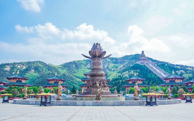 ③南山大佛、是目前世界上第一锡青铜坐佛,高高耸立在360台阶上的佛像格外明显,据说这尊佛像高38.66米,重380吨。宝座下有三层建筑,包括功德殿、万佛殿和佛教文化艺术博物馆。无论是近观还是远望都非常震撼。