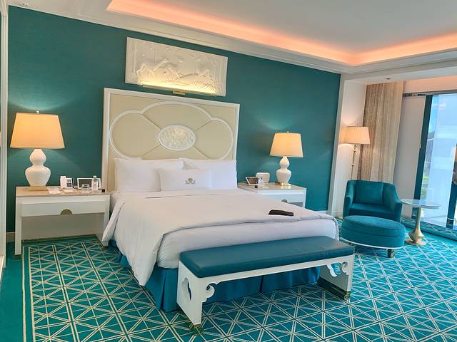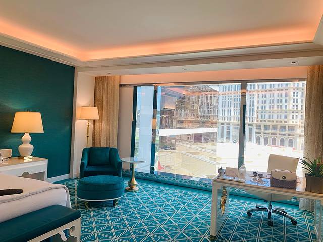 7⃣️订酒店🏨其实我是正好过了五一后去的,赶得巧,酒店价格相对来说蛮便宜了😎我去了四天,前两天订的 威尼斯人(680RMB一晚前台小姐姐还免费给我跟妈妈升了双床套房🤪)~后两天订了 永利皇宫(890RMB一晚,巧的是前台小姐姐也免费帮我们换了海蓝色套房,喜欢海蓝色的一定要感受下哟简直不要太美了,简直是了低价前完全的享受吖🥳)