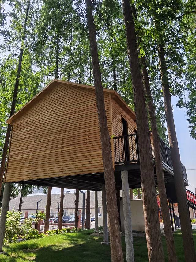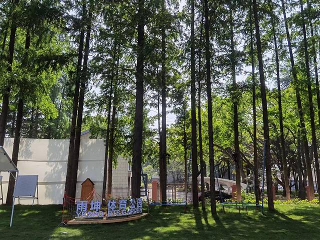 篮球馆和足球场旁边是雨坤体育公园,茂密的树林、绿茵的草坪、原木色的小木屋,很有一种大自然丛林的感觉,运动之余,在这里搭个帐篷,小憩一会儿、补充点能量,挺有情趣、也挺惬意的。
