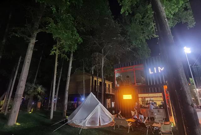 ②小森林。体育公园里,篮球馆、足球场、羽毛球馆灯火辉煌,运动的场景显得格外的酣畅淋漓,而一旁的小森林中,小木屋、小帐篷、小草地,光线淡雅,休闲的场景却显得格外的清幽安逸,一动一静构成的场景,挺有画面感的。