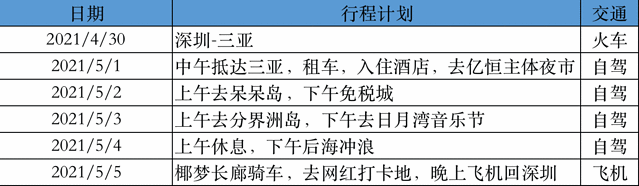 下面表格是我们的行程安排,由于我们是第二次去 三亚 ,所以行程不同。后面有时间我会写一个完美行程计划的。