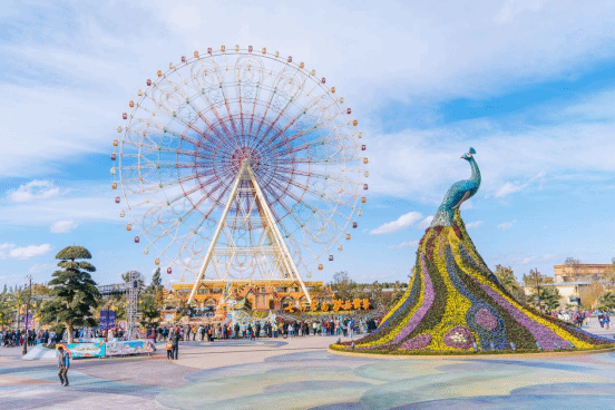 到达欢乐世界,给我的第一感觉就是蛮特别的,门头宏伟大气,鲜花打造的巨型孔雀雕塑简直不要太吸睛,而且还是云南独有的绿孔雀,可见乐园的用心。