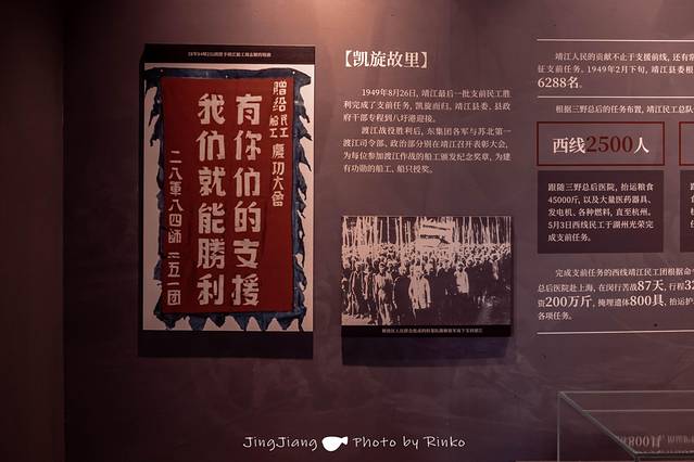 走进东线第一帆纪念馆,属于那个年代的爱国情怀迎面而来,从展示的老照片中,能感受到靖江人民做出的巨大贡献,也有那些军民之间的动人力量,他们协力把隐藏的船只拖出,以便在渡江时使用,许多靖江人民还帮助他们用土办法制作简易设备。