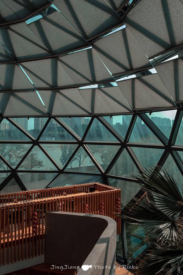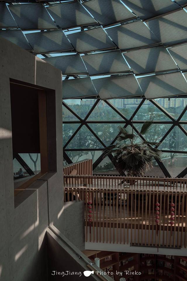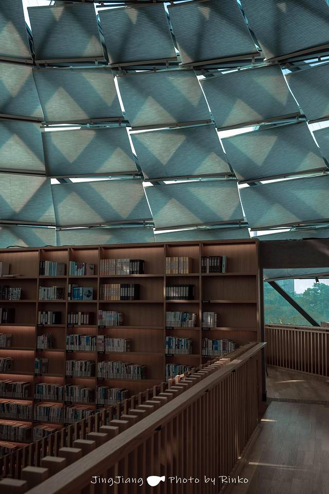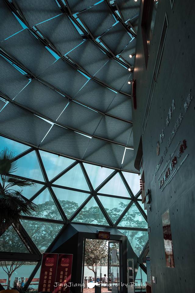 马洲公园里坐落着一座设计感满满的图书馆,椭圆形的外观如同一只降落的飞碟,几何的玻璃外墙科技感十足。