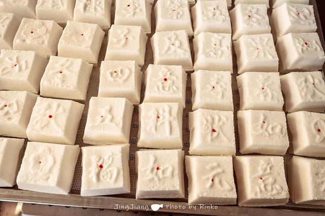 过去茵糕用草药茵陈作底,可清热去火,祛湿。如今茵陈被荷叶取代,但茵糕的名字被沿用至今。老板娘热情地要我们尝尝,入口有浓郁的米香味和荷叶的清香,嚼起来很有弹性,除了茵糕,还有印有文字的小方糕,小方糕内有豆沙馅儿,甜香可口。