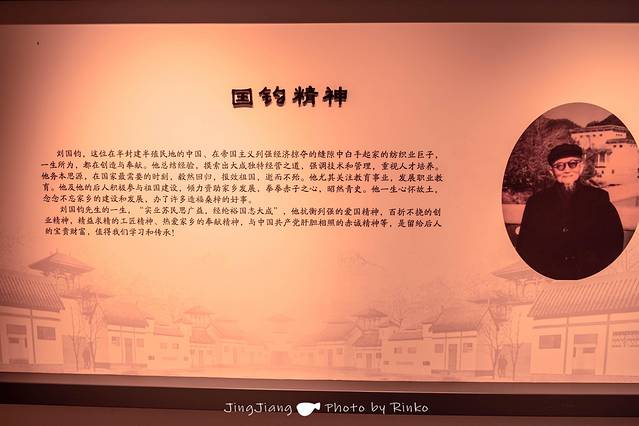 刘国钧故居是刘国钧先生生前的居所,故居的建筑风格颇有江南特色。传统的中式院落、门庭格局、屋檐瓦片都独具匠心,它们静静地述说着刘国钧先生辉煌艰辛的过往。纪念馆由“生平事迹——饱经风霜”、“艰苦创业——惊艳人生”、“梦萦故乡——毅然归来”、“纺织大王——实业兴国”等展示内容组成。当中最令我印象深刻的是,刘国钧先生率先使用的盘头纱纺织生产丝绒、灯芯绒。方知,我们曾经穿着过得衣服材质与这位先生有着莫大的渊源。