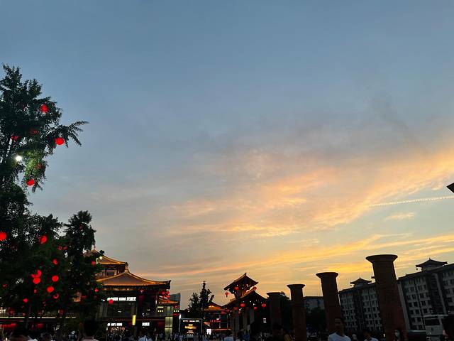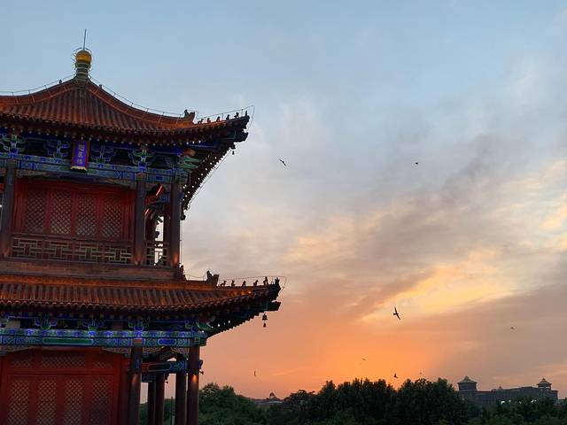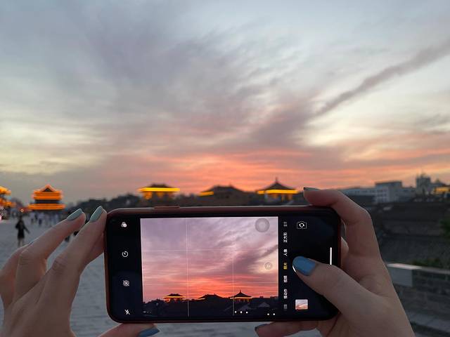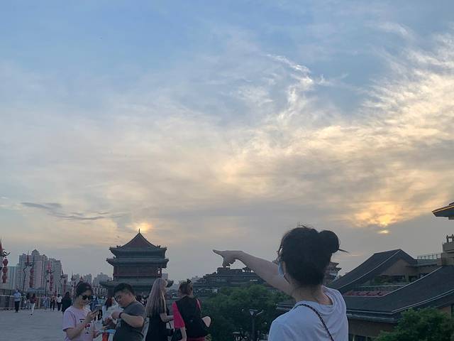 坐地铁到的城墙,长安的天黑的比较晚,到城墙那会儿已经18:30,天还是很亮,之前看人家说上去骑自行车看落日,但是到现场打听了一下骑完一整圈要3h+,于是打消这个念头打算就走走感受一下,拍拍照之类,上去城墙要门票,50还是60一人,学生证好多经典可打折(可惜我不是学生)上去城墙有单人车/双人车,费用另外算,很多燕子还是啥鸟类在天空盘旋,非常有感觉,天色绝美,天黑后建筑群会亮灯,我们还有幸看到了七彩云,城墙那边有摊贩贩售汉服,有很多人穿着汉服在那边拍照