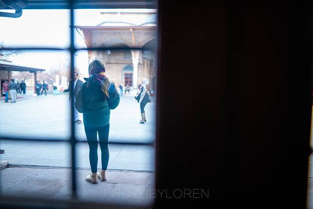 因为伊斯兰教的文化影响,来这里的女性都需要包上头巾。尊重文化差异,媳妇包上了她的围巾。