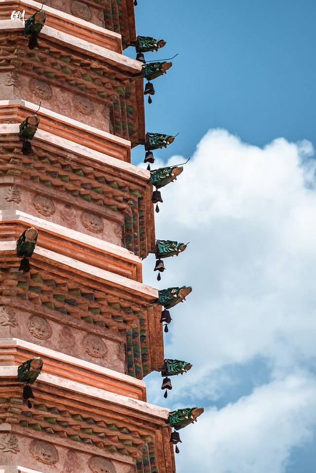 东侧的塔称为东塔是一座正八角形建筑,高13层,每层塔檐下,各面都有各种兽头的浮雕,