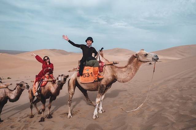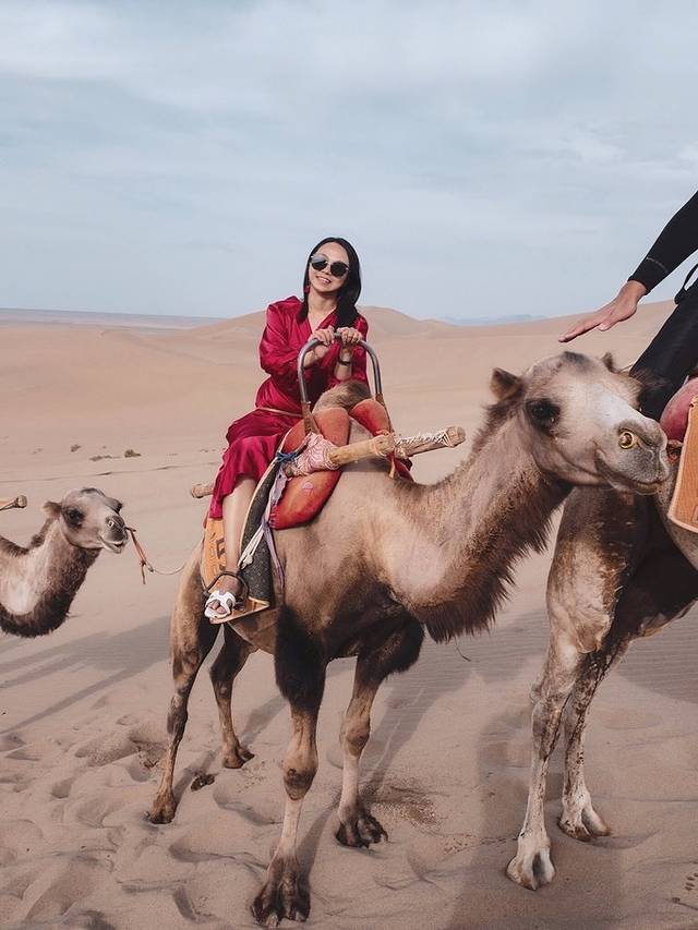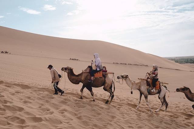 在沙漠之舟骆驼背上欣赏大漠,起起伏伏,有别于骑马的感觉。沿途可观赏到丝绸古道和塞外壮美景色,感受“大漠孤烟直”的情感。从山脚一直走上月牙泉,5只骆驼为一组行走,体验大约1小时,期间领路人会帮忙拍照,小费20元,我觉得不算贵,毕竟步行领骆驼上山挺幸苦的,也能拍照留念。