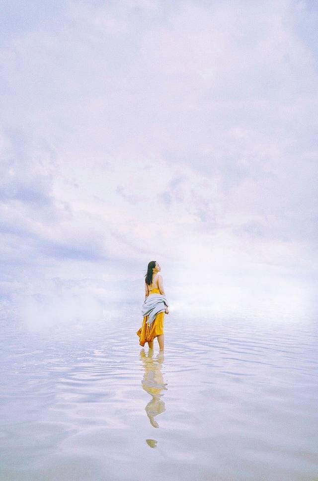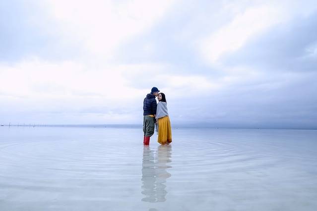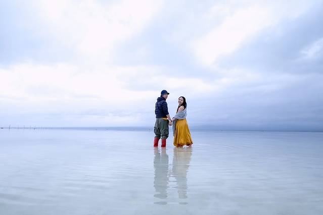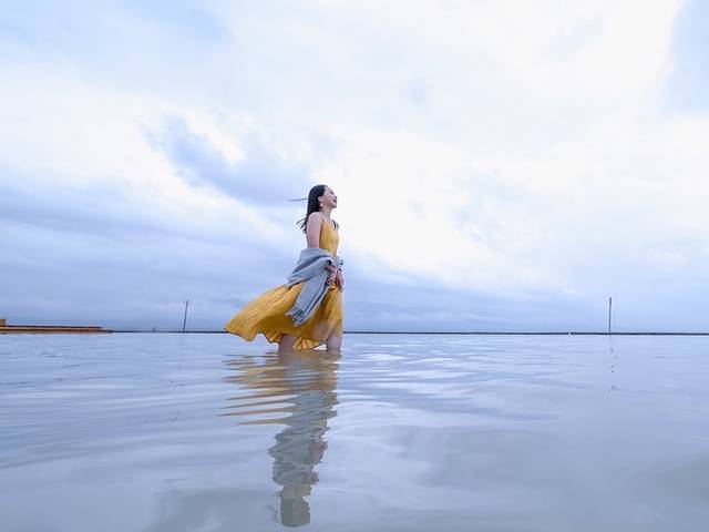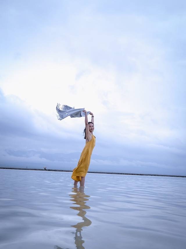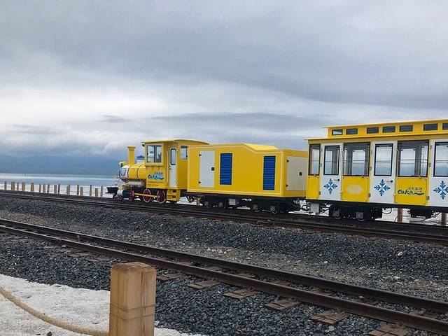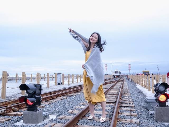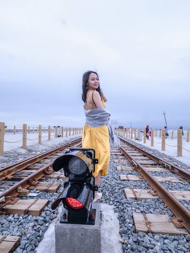 最吸引人的地方是那条通往湖心的铁轨,坐上小火车横穿茶卡盐湖。沿途看到两边湖面若隐若现雪白的盐,远看仿佛在雪地穿越。我也是一个狠人,当时温度大概10度左右,在湖岸上跟CJ先生说既然来了,就要把想拍的拍了,然后径直的走下盐湖。在盐湖一定要穿鞋行走,湖里都是粗盐,光脚被扎得根本无法前行。没有看到“天空之镜”这美景,却收获了另一番风景,镜头中散出的是茶卡盐湖另一面独特的魅力~