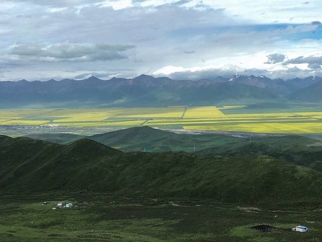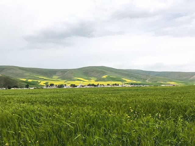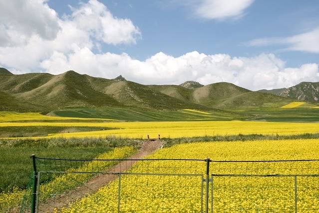 们去的时候刚好是 门源 油菜花盛开的季节,油菜花开得正旺,黄黄的油菜花就重叠在这错落有致的田野里,远远望去大地像铺上了一条金黄色的地毯,跟山间草原相衬又像一幅美丽的油画。