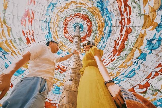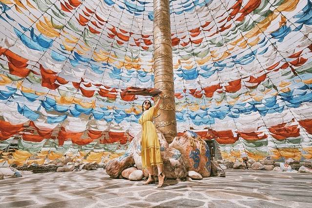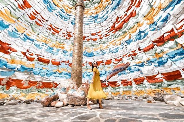 彩锦的配色感觉就是有讲究的,红黄蓝绿白层层相隔,中间支撑的柱子让我想到了孙悟空的金箍棒,顶天立地。站在里面拍照,就像被一个彩色巨幕包围。