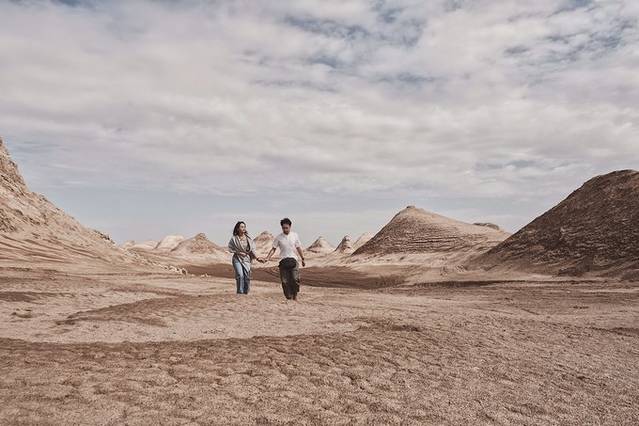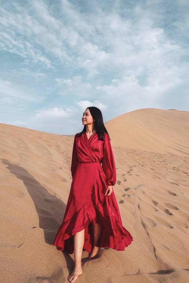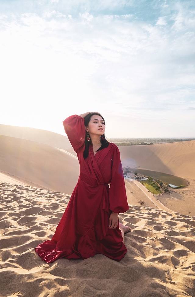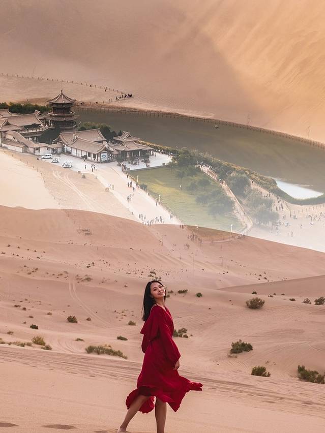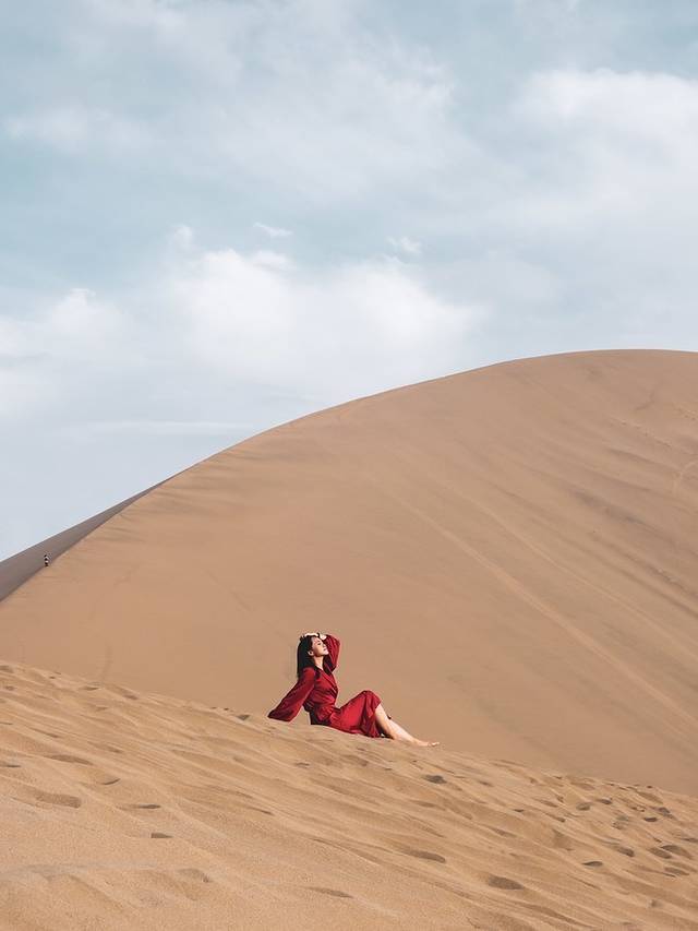 想要拍到荒漠大片,一定要走得远!大部分游客都是爬到鸣沙山俯瞰月牙泉🌛,在山顶上欣赏大漠日落🌄,人多拍不到 西北 大漠的苍凉广阔。你可以走远一点的无人区,枯树和沙漠绿植都是很好的场景“道具”。