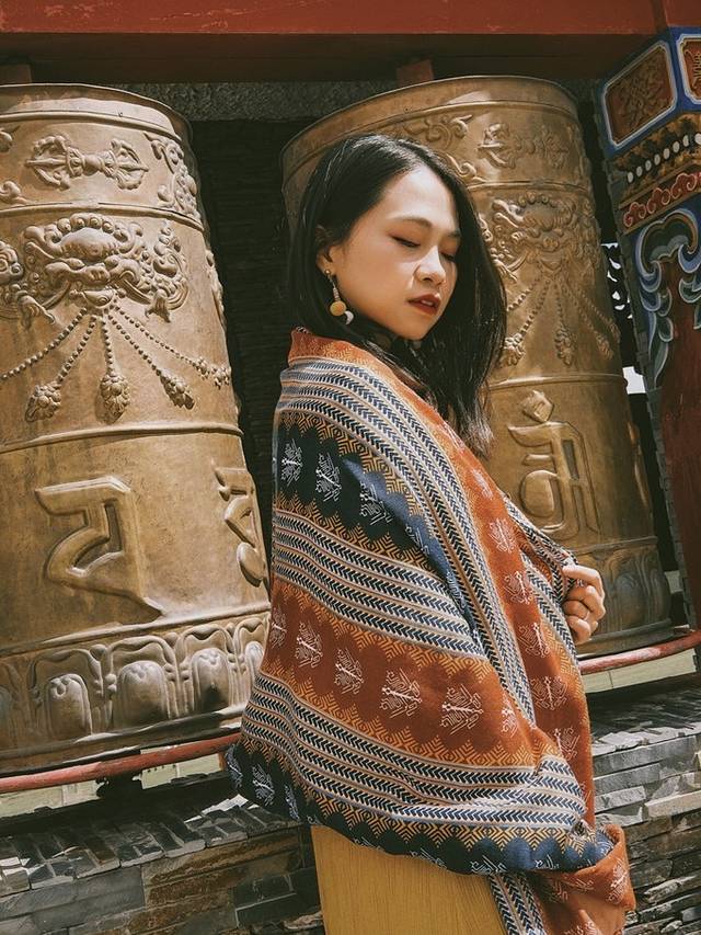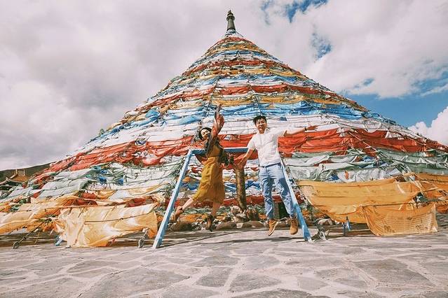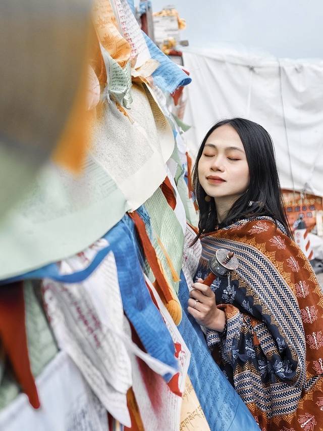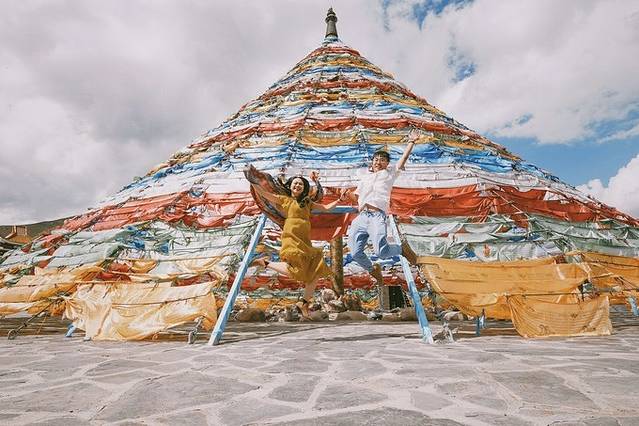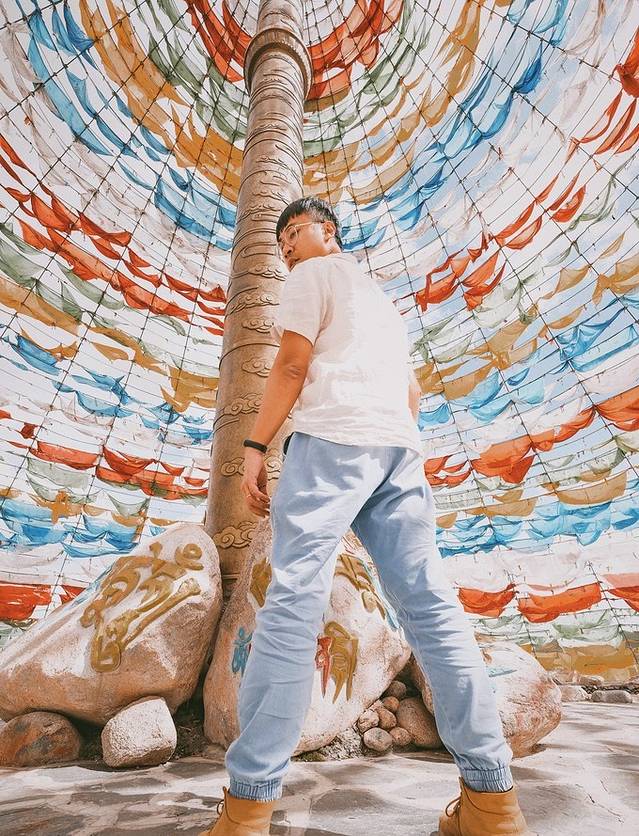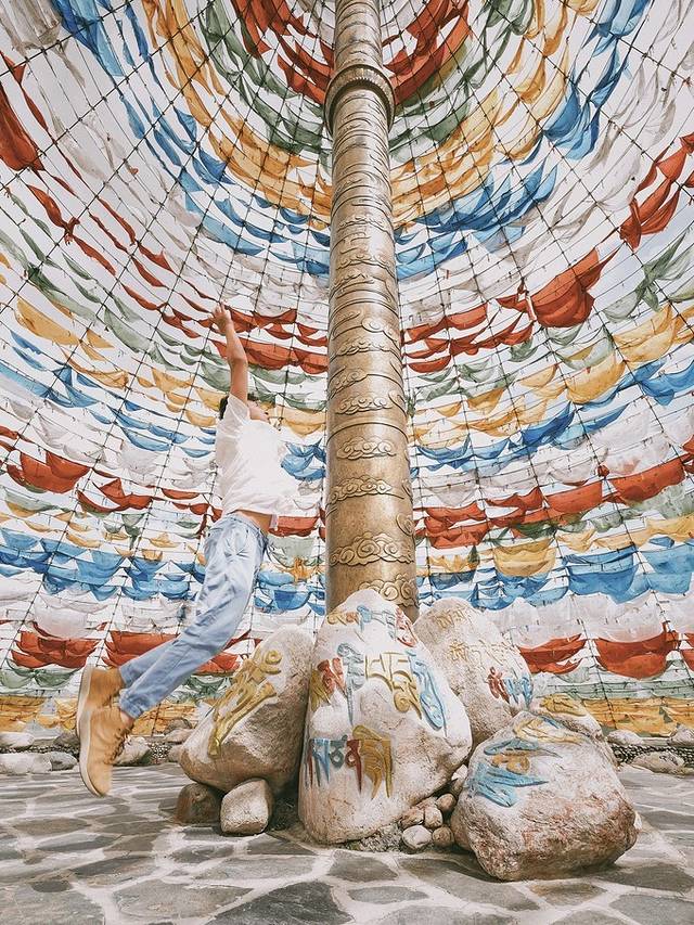 依山而建的观光栈道,缓缓上爬一直到观景台,周边群山环饶,天高地阔让人心旷神怡,随便按下相机快门都是壮美的风景画。我是为了祥瑞风马而来的,以前在电视、展览上看到都会被它的美吸引,所以这次计划行程的时候就跟CJ先生说一定要来这里,不可以删减!仅仅远观就有一种圣洁感,巨大的伞状彩锦在风中摇曳,彩锦上都写满经文,寓意聚祥瑞通天穹。