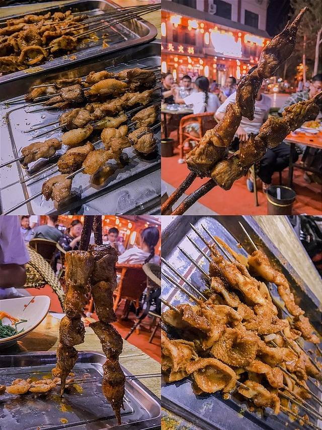 烧烤 / 印象最深刻的是在 敦煌 吃的[城边边烧烤],盐煎肉、烤羊肉、沙漠红柳大串、烤羊排…你想到的和没想到的都有,羊肉都很香嫩,油脂烤得甘香,淡淡的羊骚味。
