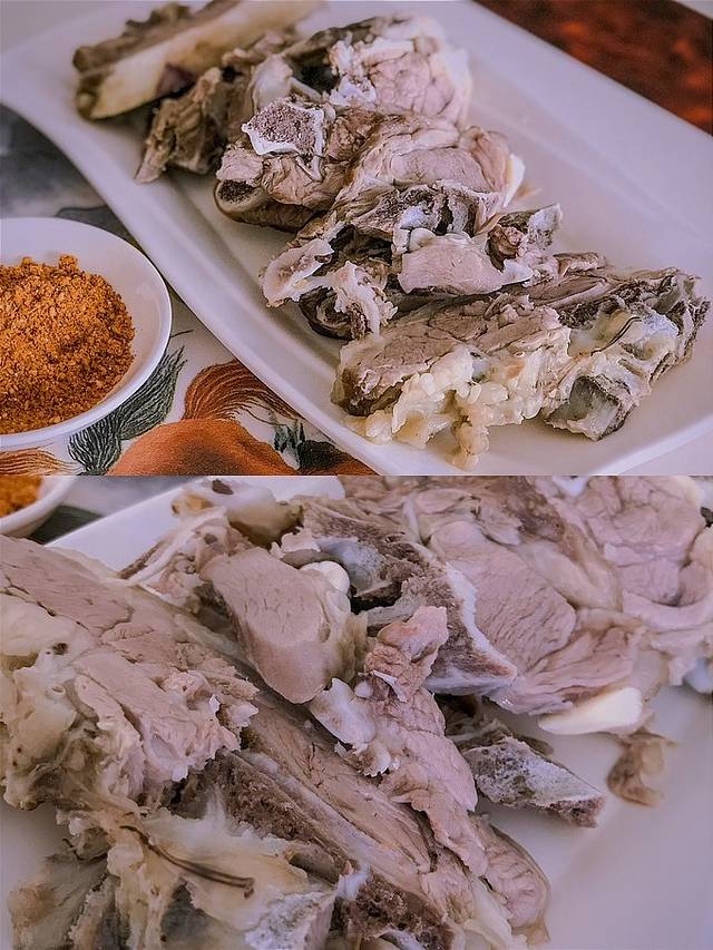 手抓肉 / 追求的是原汁原味,没骨头大块肉的口感。肉质很嫩,配醋和蘸干辣椒粉吃。