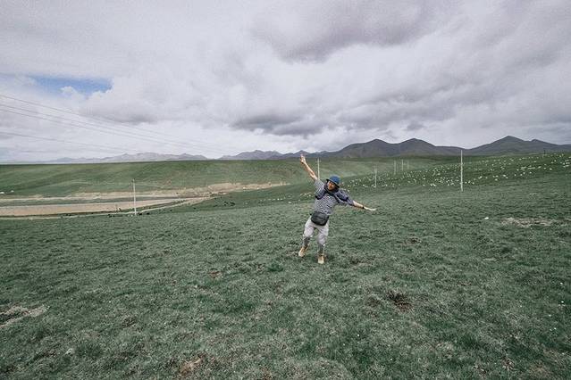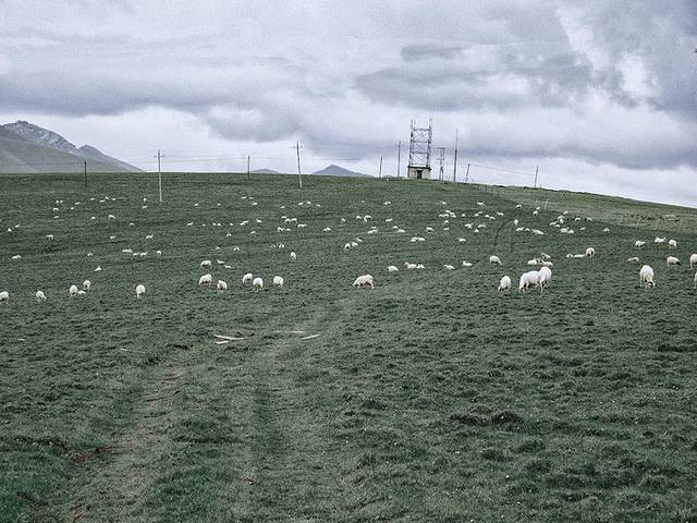 放眼望去,草浪一波一波地荡漾开去,几朵金黄色的小花儿,点缀绿毯之上点点滴滴、千姿百态,成群自由放牧的羊儿像天上的白云,一朵一朵洒落在大草原上。看着很近,可是我每次“咩~咩~”叫跑过去想拍照的时候,羊群也跑了