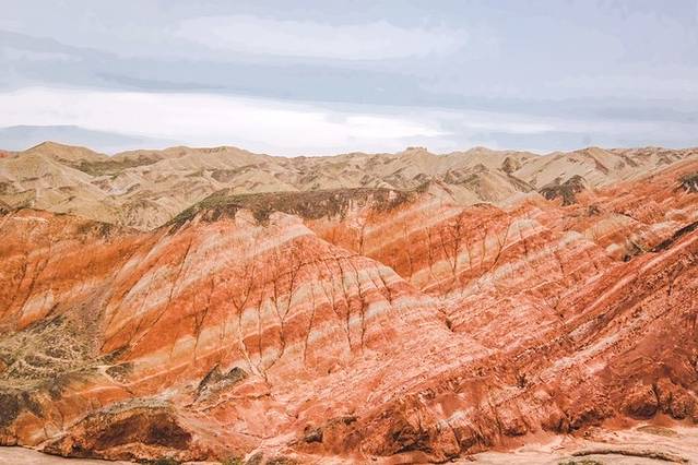 丹霞地貌真的是个奇观,受 祁连 山⛰地壳运动导致板块挤压,层理交错、岩壁陡峭、造型奇特、色彩斑斓,随处可见有红、黄、橙、绿、白、青灰、灰黑、灰白等多种鲜艳的色彩,色调顺山势起伏呈波浪状,在阳光️照射下,像披上一层橙红轻纱,形成一幅灿烂夺目的壮美画图。