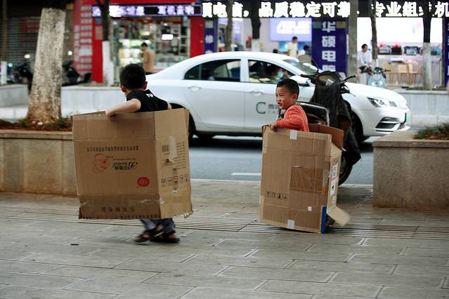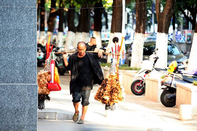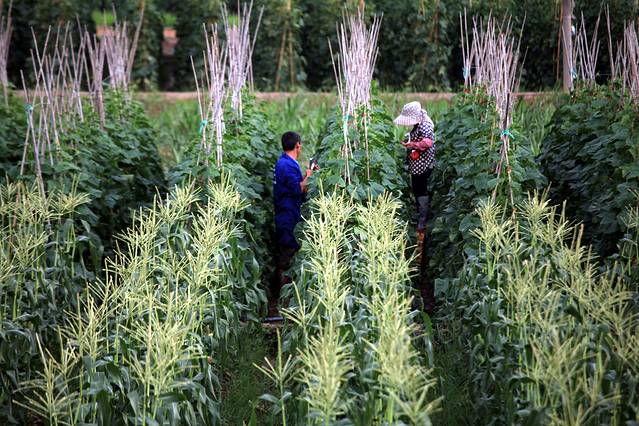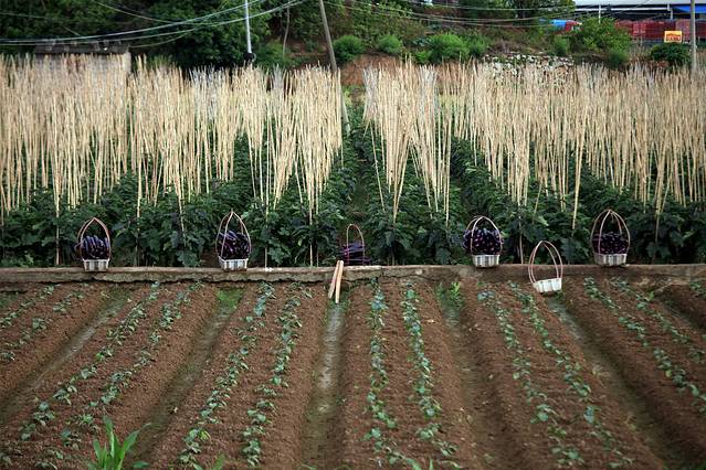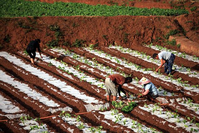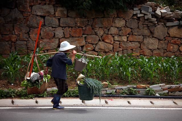 步伐匆匆,这是应该刚收割的蔬菜拿去卖。
