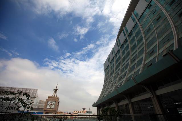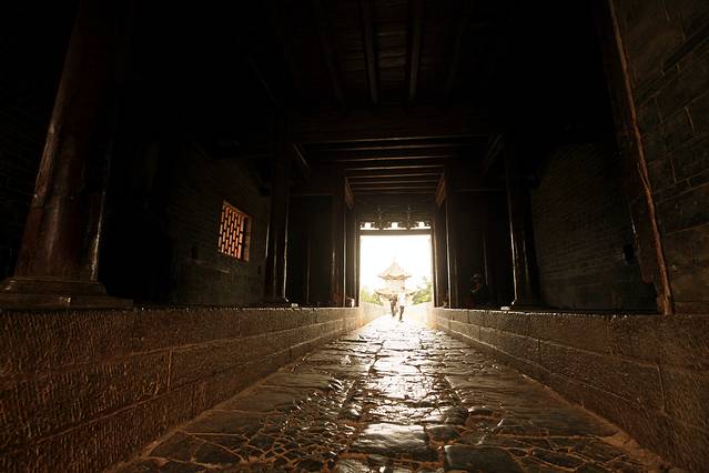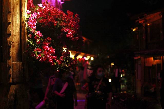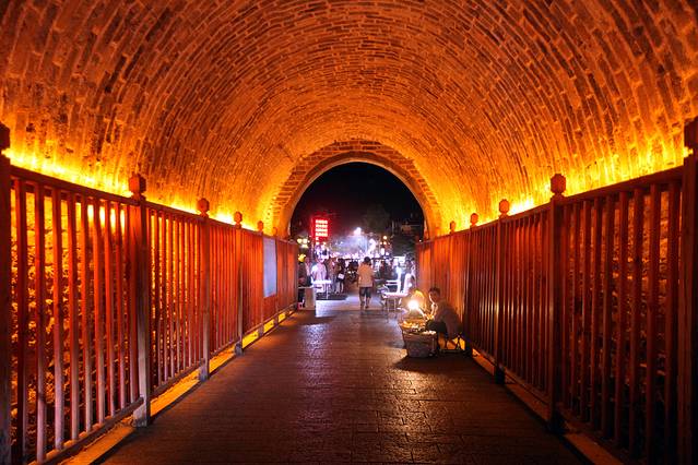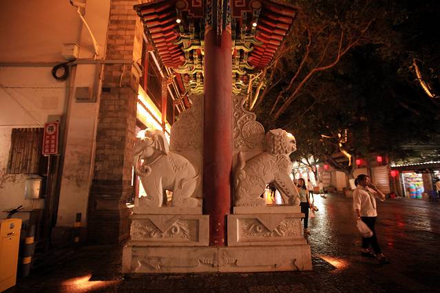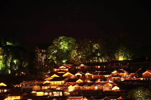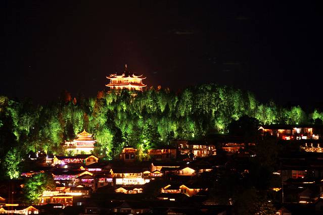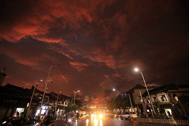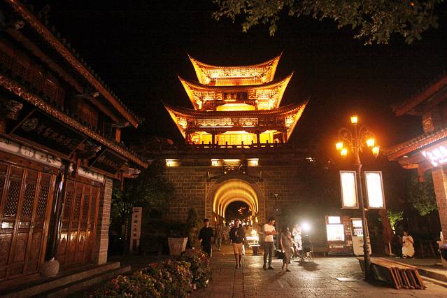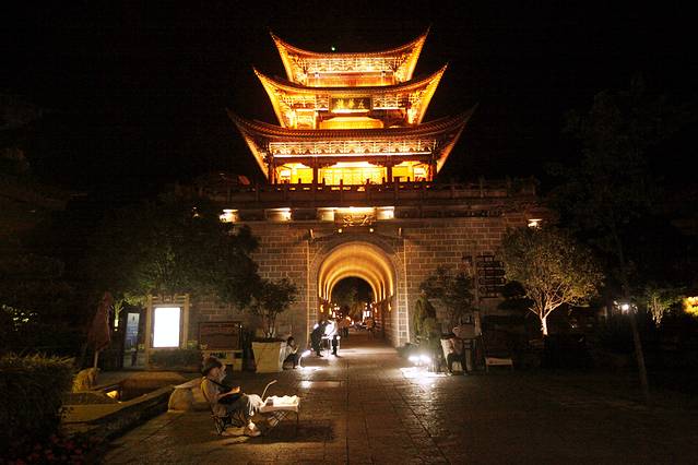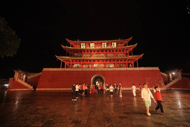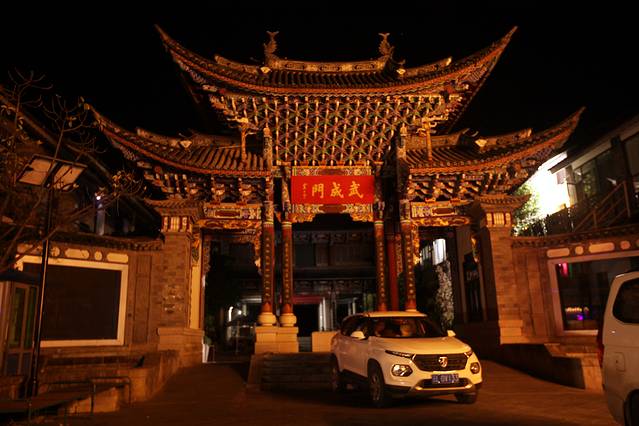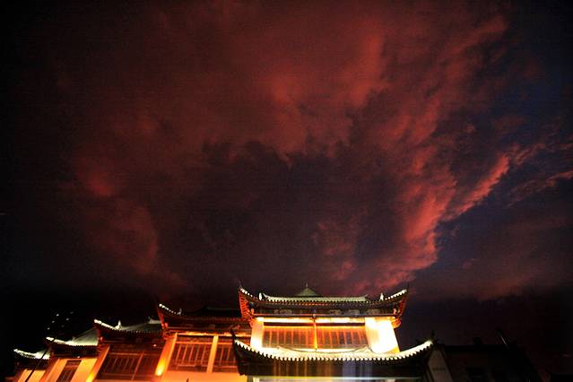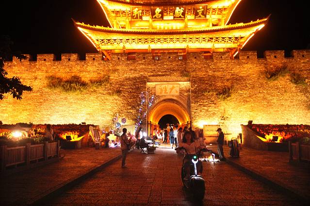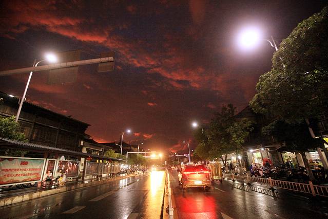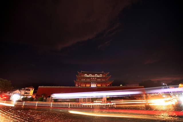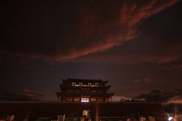 到了古城门口,灯光反射到云上,有特别的效果,手持相机拍两片。