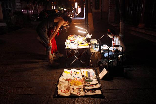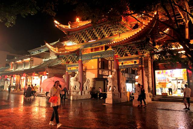 雨后的街道干净清洁,花岗石面反照着临街的灯光,旺中带静。