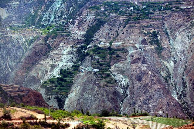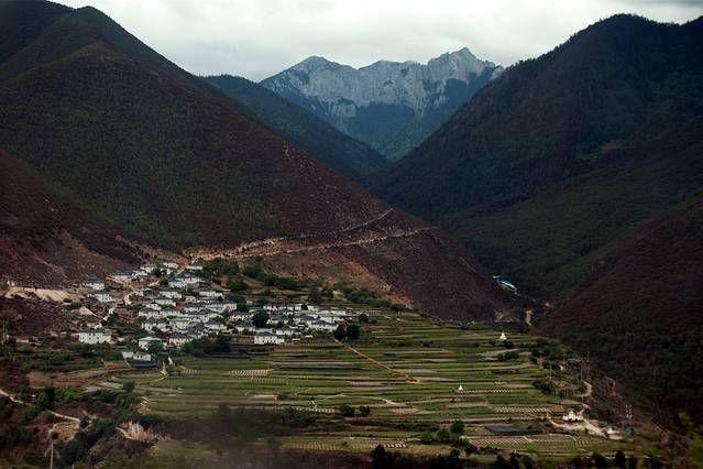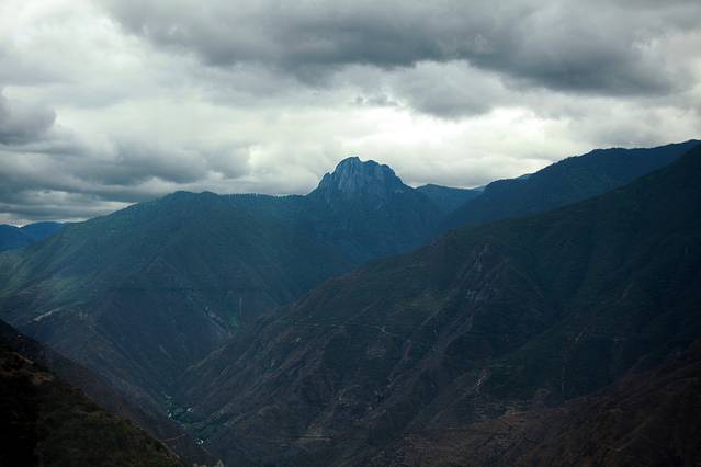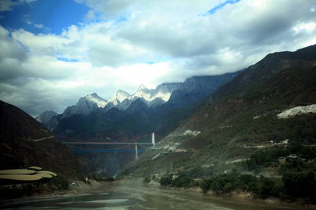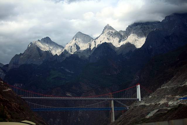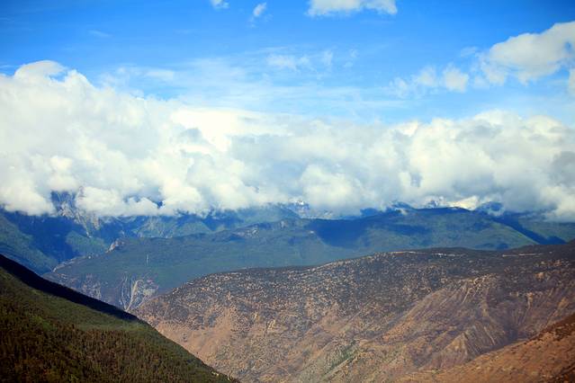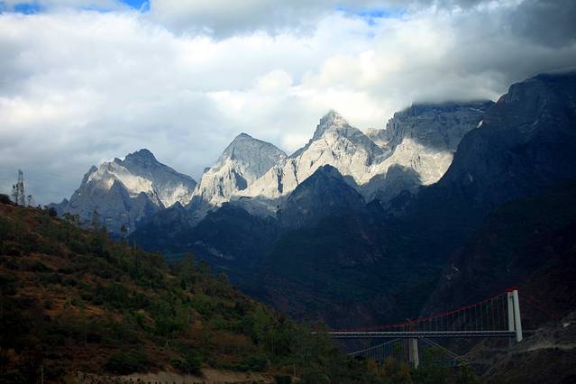班车经过虎跳峡镇,看到了玉龙雪山的另一面,山石峥嵘,顶上寸草不长,而最后的雪线也没有了。