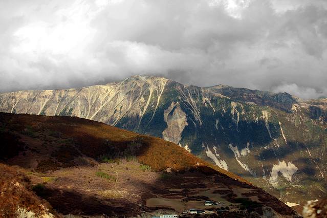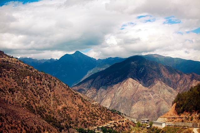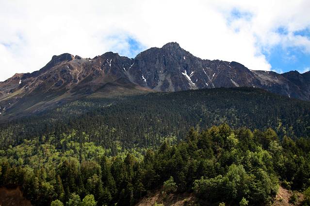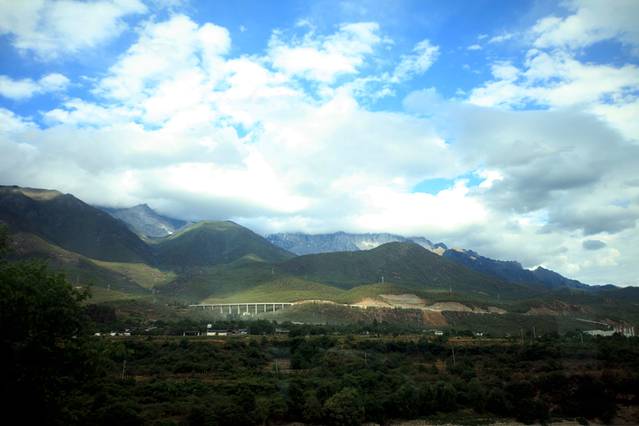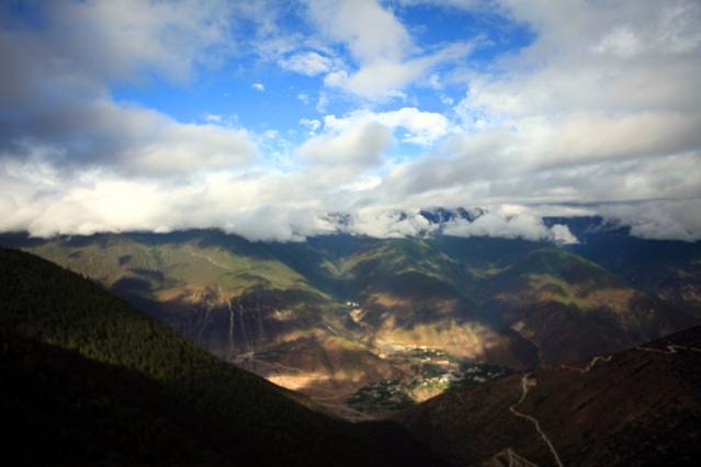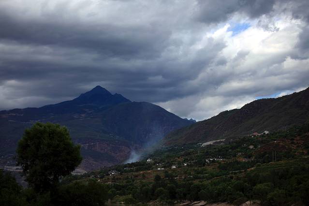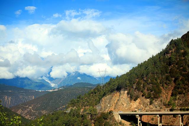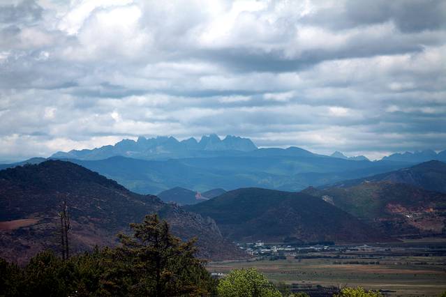 光溜溜的远山就是石卡雪山,一丁点雪也没有,不上也罢。