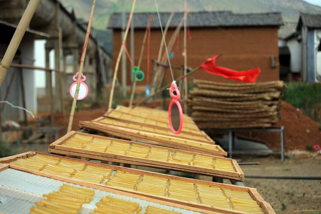 这是凉晒的一种当地面食,挂的镜子随风摇动,利用反光面驱走蚊蝇等小飞虫。