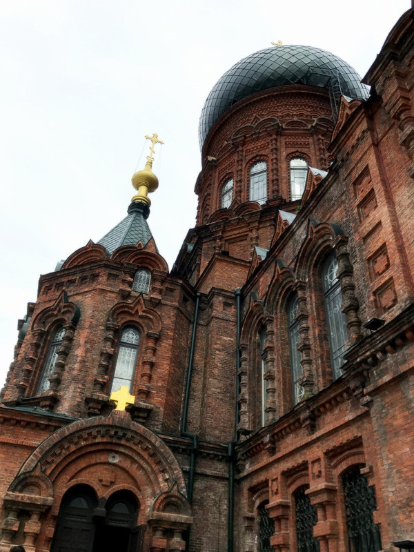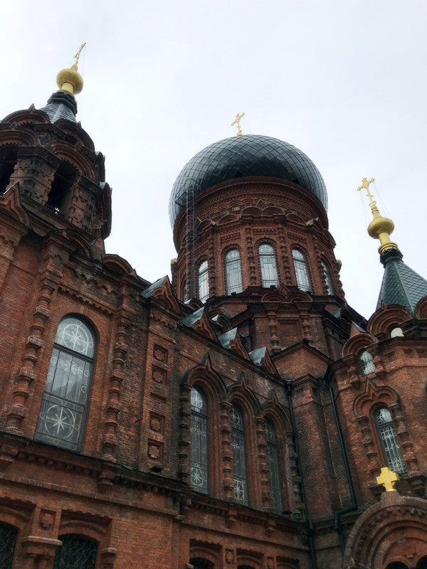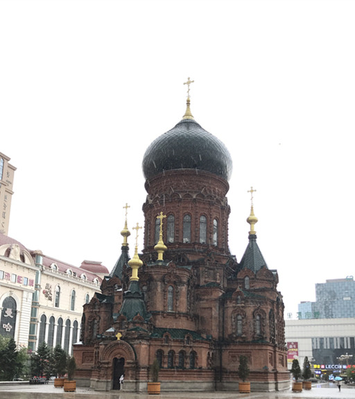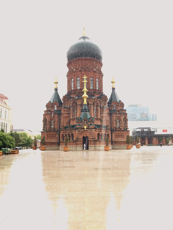 刚下了公交,来到教堂的广场,大雨,又落下了,原先广场上人很多,一场大雨把人群都“驱赶”到了无屋檐下、亭子里、或者路边的小店里,也正是如此,我才能拍到被雨水冲洗后的,比较没有“路人背景"的圣索菲亚大教堂全景。