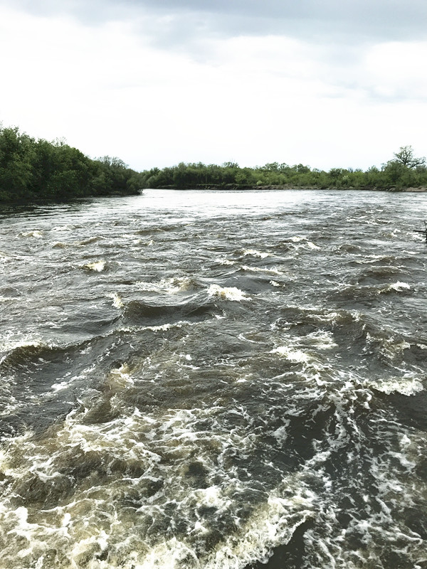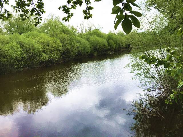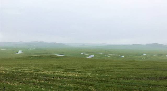 沿着木梯上去,爬到了湿地公园的最高处,从“壮美山河”的观景台向下俯瞰,天空很低,云朵有些灰暗,远处的山,近处的草,还有蜿蜒的莫日格勒河。