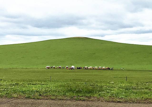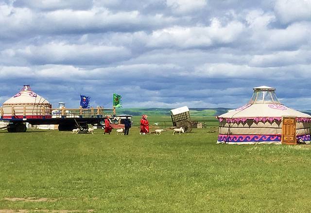 大约车辆行驶了半个多小时,森林逐渐稀疏,逐渐地被我们远远地甩在了后头了,天越来越晴朗,草原也越来越绿了,可以看到远处的蒙古包、勒勒车。