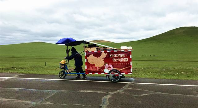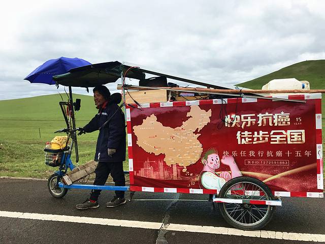小视频平台上经常看到直播的徒步者,在这里也遇到了一位。原先以为的徒步,一个背包就能走遍天下。而在这一望无际的大草原里,徒步的人,背负着的不止是背包,更是一个重重的“家”,他们拉一辆重重三轮车,徒步而行,车子虽是负担,但也可以遮风避雨,更可以让徒步者免于露宿街头。这不也是人生吗?每个人都是人生的徒步者。