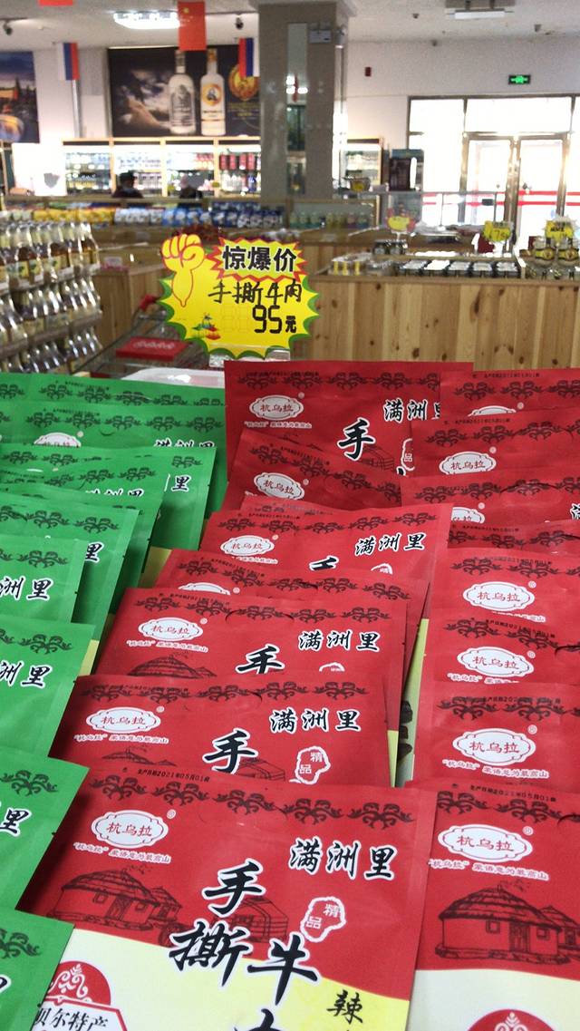 后来,带我到满洲里市区的小巷子里,一家小肉厂店,说是熟人生意,一进门,柜台上面放的满满当当,像是刚做出来的牛肉干,还没有包装,而隔着玻璃窗,还能看到在小作坊里面正在烤制着的牛肉干。老板娘一看就是当地人,一脸很飒气的样子。见来了人,很快就把柜台里的牛肉干,各种口味的都端出来,让人试吃,味道确实不错。一问价格198块一斤,也不便宜。而后她说,有真空包装好的小袋装,方便携带。我买了半斤,告诉她不要辣的,只要五香和原味。结果她一个飞快的手速从盛着各种口味的包装好的牛肉干里面搂了一大把装进大包装袋里,一上秤有一斤多,我坚持只买半斤,她又迅速地秤好半斤然后封装打包,以至于我也没有再次验货的机会。现场我问老板娘说,能不能加个微信,以后如果想买再找你,老板娘直接答复,你找导游刘姐就可以了......付款的时候,支付到她的个人微信号,没有店铺,也没有给任何收款收据。