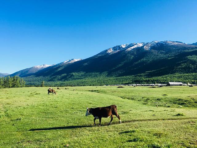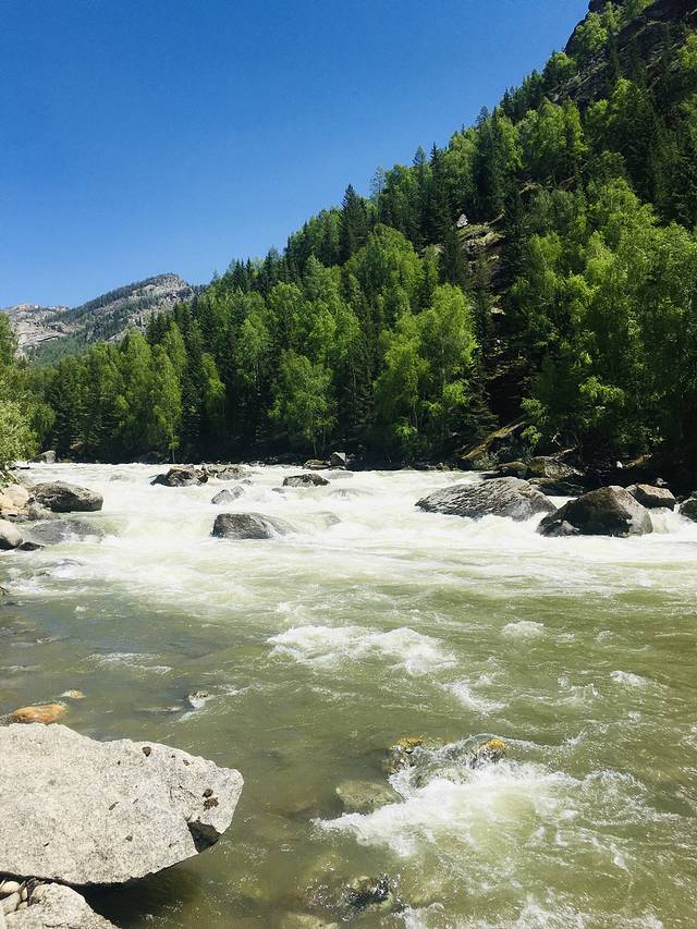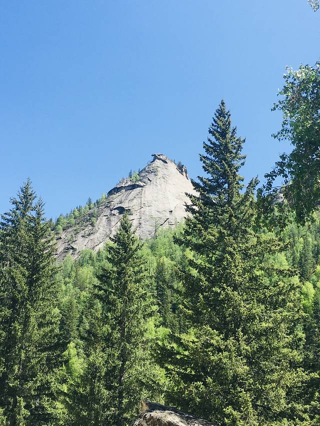早上起大早开车去了可可托海,有山路要走,遇到羊群、马群、牛群等等,开车需谨慎。可可托海景区门票121元,进去门口至神钟山有区间车,其余里面景点无区间车,单程7.5公里,需要步行,看个人体力来回得两三个小时,走走停停。可可托海以优美的峡谷河流、山石林地、矿产资源、寒极湖泊和奇异的地震断裂带为自然景色,有很多象形的山峰,山谷间有冰川融水流过,很是清澈。另,景区路上有很多牛羊马粪,很是有“内味儿”!