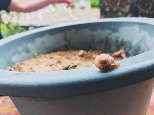 发现一只可爱的小蜗牛,自己慢悠悠的在花盆上溜达着,也不知道下着大雨,它想去哪。稍微有点害怕,不敢碰它,不然就帮它一把,带它走了,哈哈。