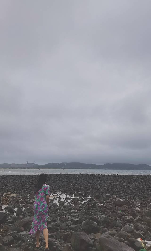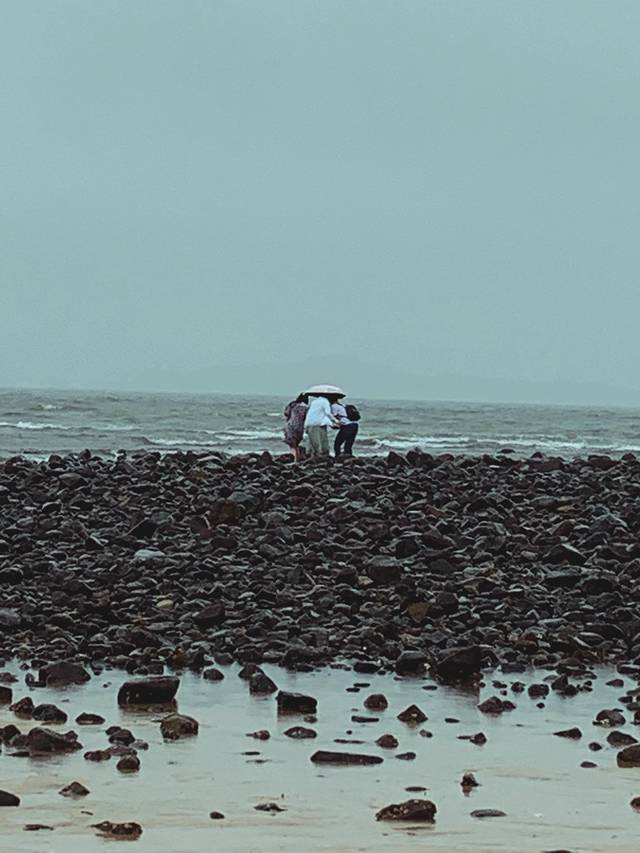 看着不远,没想到一路走过去这么艰难。正好走到中间的时候,突然就下大了,于是进退两难,想着既然来了,那就坚持到底走到海边吧。于是花花、梅梅我们三个就冒着大雨往前走。