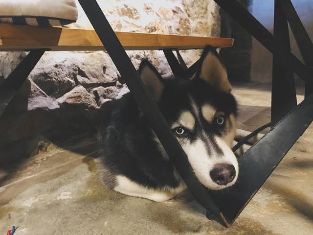 这只二哈简直要笑死我了,写完明细片在屋里面溜达溜达,一低头才看见桌子下面有这么一直小可爱,一动不动的,进来这么久都没发现它,给它拍照,就这么二乎乎的看着你,也太可爱吧。