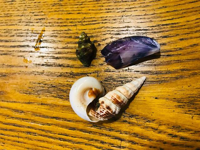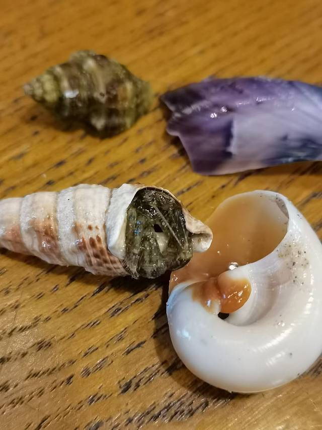 回来的路上,顺手在沙滩上捡了几个小贝壳,没想到里面竟然还住着一只寄居蟹,真是强制性给它搬家了,哈哈哈。正好还捡了一个大点的贝壳,想着给它换个大房子呢,这小家伙就一直躲在里面不出来,数次想背着房子逃走,哈哈。