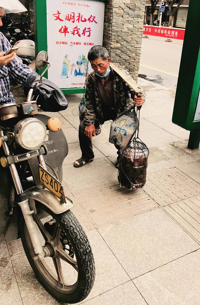 吃完饭之后,来接我们从车还没到,于是就坐在门口等,这个叔叔不知道挑的是什么鱼,红色的,由于语言不通,但是特别的热情,一直在跟我说,可惜我是一句都没听懂。