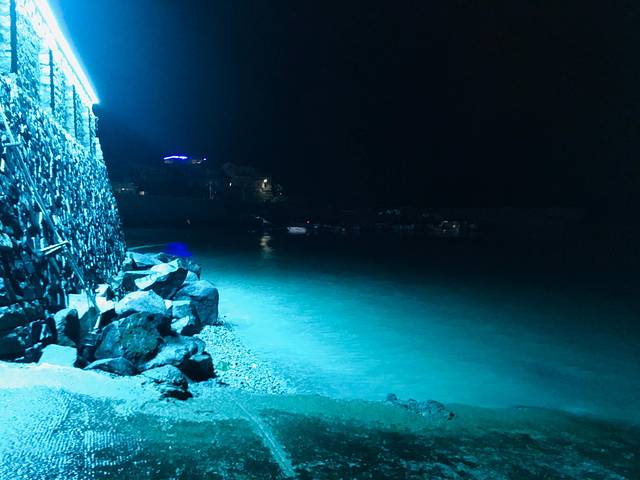 差不多晚上10点多,我和花花一点都不困,据说这里是能看到蓝眼泪的,于是我们俩大晚上又出门溜达了,由于是在太冷,直接把民宿的浴巾裹在了身上,两个小贵妇,哈哈。