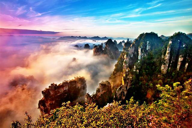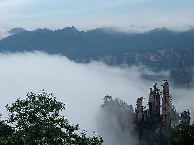 天子山云雾为中外旅游者所赞叹。雨过初晴的天子山,云雾景象十分壮观,奔涌的云雾形成瀑、涛、浪、絮多种形态,连绵浩瀚,波澜壮阔。