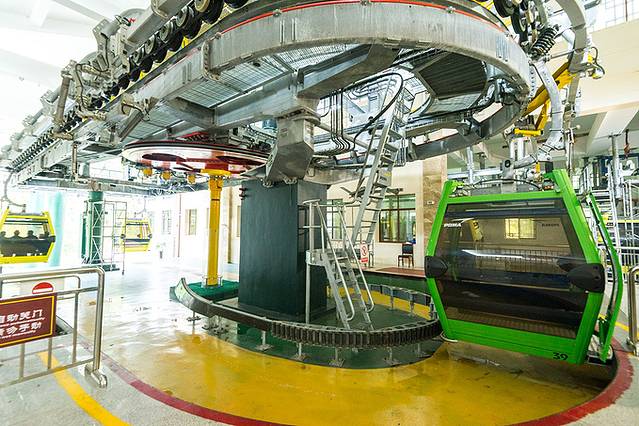 索道线路斜长7455米,上、下站水平高差1279米,是世界最长的单线循环脱挂抱索器车厢式索道,其中98个轿厢来自于瑞士CWA公司,轿厢体高2米,单个造价高达20万元人民币,尤其那6米/秒的运行速度设计、1000人/小时的单向运量、38度的最大斜度,这在国内乃至全世界都为罕见。