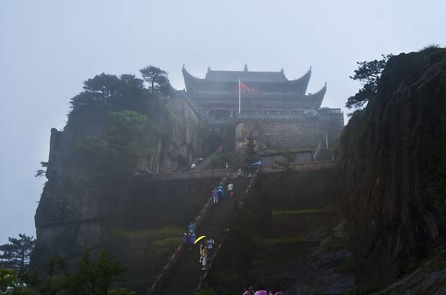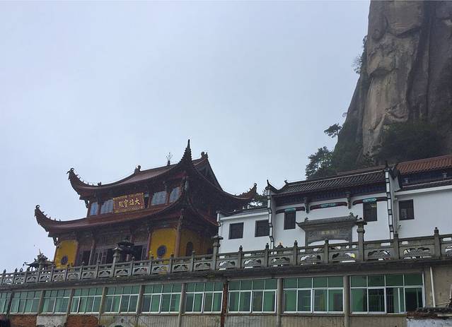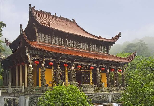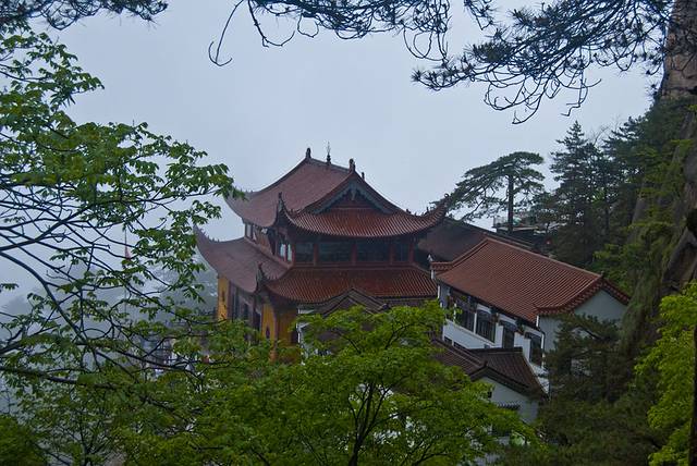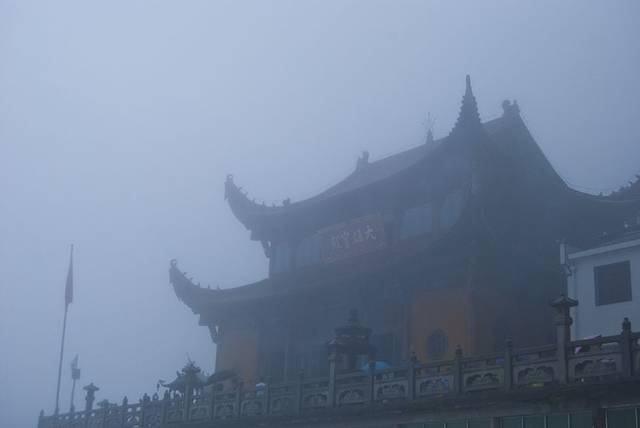经典的九华山名片呈现在眼前,造型美观,翅角高耸,飞桅凌空,在漫天雾气中忽隐忽现,真是神仙圣地呀!至寺前回首一看,左有龙头峰,右有龙珠峰,对面十王峰。