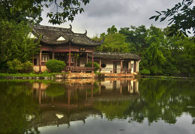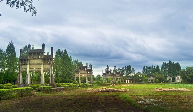 就这样在时雨时歇之中游览。多年前竹林掩映中的十三楼给我留下了深刻记忆,今天再次来到她面前时却甚是失望,小楼的前侧面新建了一幢仿古房屋,挡去了大半古楼,悠然仙舍般的十三楼再也不是当年的模样了,只好抱歉地向女儿解释,女儿也不甘地换着角度,希望找一个不被新屋遮挡的地方来欣赏我向好描述的美妙画面,最终还是无奈离去。