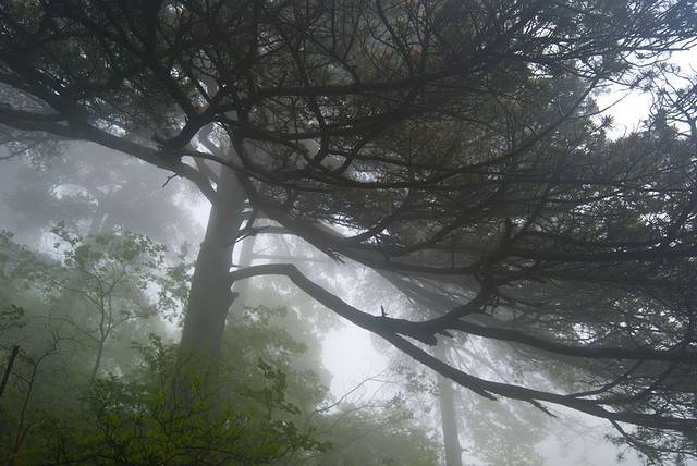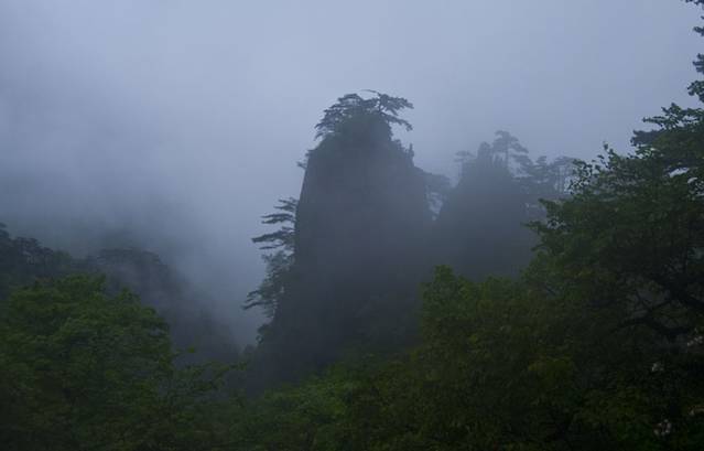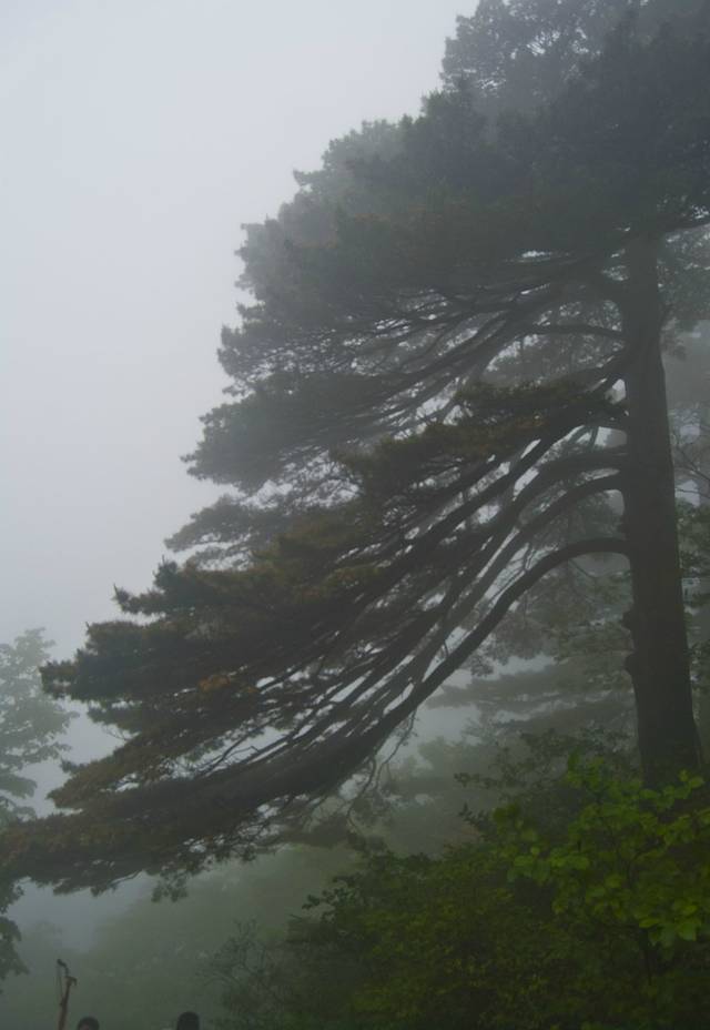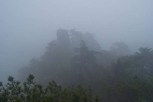 从昨天女儿的照片中知道这里有大片造型秀美的山峰,可此刻的眼前雾朦朦一片,如此天气我决定多在此逗留一会儿,不再往前走了,差不多就回去乘索道下山吧。期间,雾气小时也只出现一点山影,全无昨天的景像了。