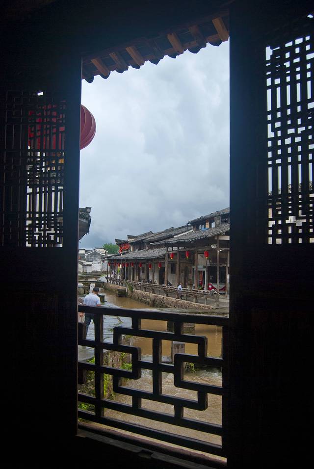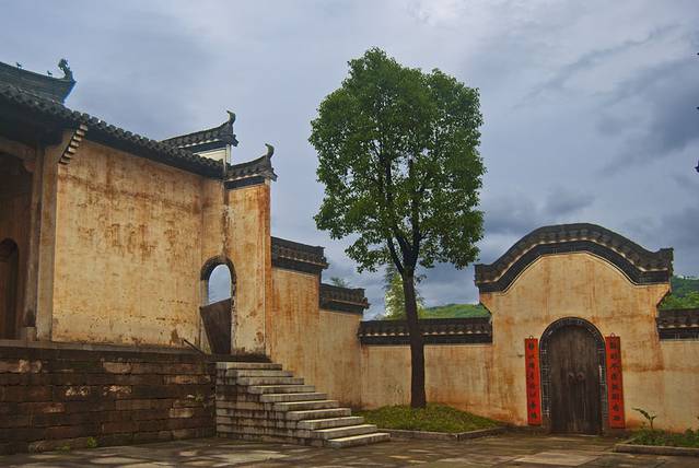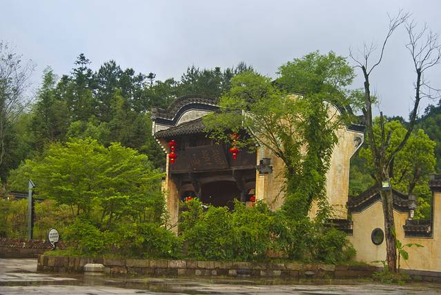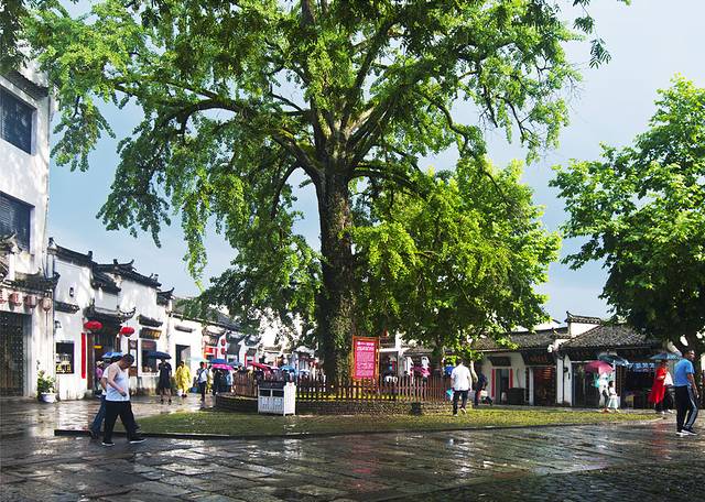 刚进入村子又下起了雨,虽然有雨具还是避了一会儿,大雨将结束时忽然出现了靓丽的阳光,将徽墙黛瓦及高大树冠上洒下一片别致的亮色,哇!这光线美极,顾不得地上的水跑出来快速按下快门,抓住这稍迅即失的景色。