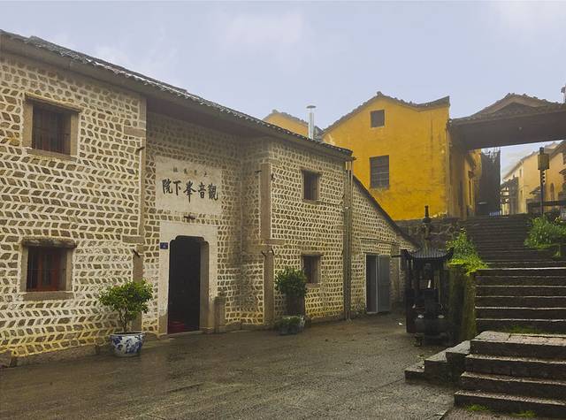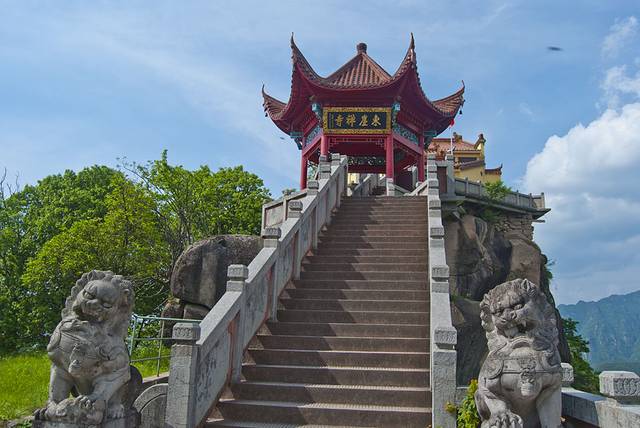之后沿山路走一段便是高高台阶上的东崖寺,九华山四大丛林之一。唐开元末年,新罗国王子金乔觉初来九华山常在此晏坐清修。唐至德二年(757),山下居士诸葛节发心为金地藏修建化城寺,为其居住。明正德年间,有僧周经于此结茅,后建“晏坐堂”,以祀金地藏。明万历年、清同治九年重建,后被焚。其后移建于化城寺东,称东岩下院。