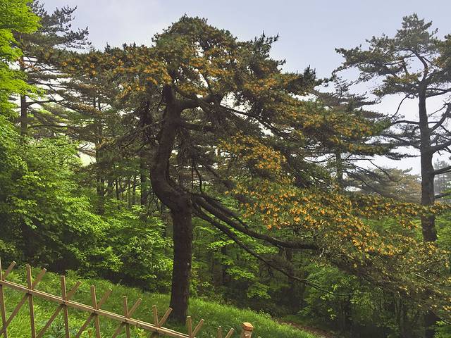 出了缆车站要下一大段台阶,才能来到凤凰松交通车站。从这里沿小溪向前再走一点便是闵园尼庵古建筑群,这是一片优雅的清静所在,大片的绿树茶园中点缀着一幢幢黄墙庵舍,如世外桃园般悠然, 我们享受在如此气氛中,漫步小溪边,对岸的凤凰松如一把巨伞呈现眼前,与周围的环境和谐美艳。返回时感叹着今天这个无人问津的景区带给我们的美好感受。