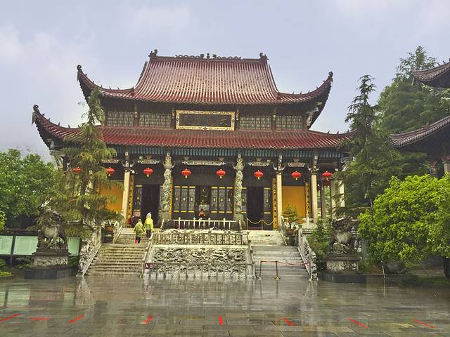 步入寺门是灵官殿,过一小庭院,一方形重檐殿堂是天王殿,从殿后小院上石阶十余步,便到大雄宝殿。大雄宝殿殿内宝气凝聚,煜然炫灿。